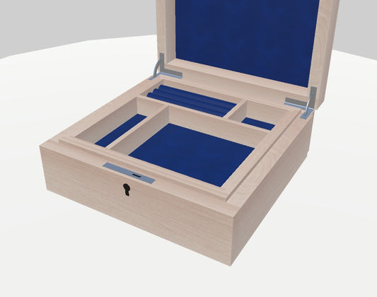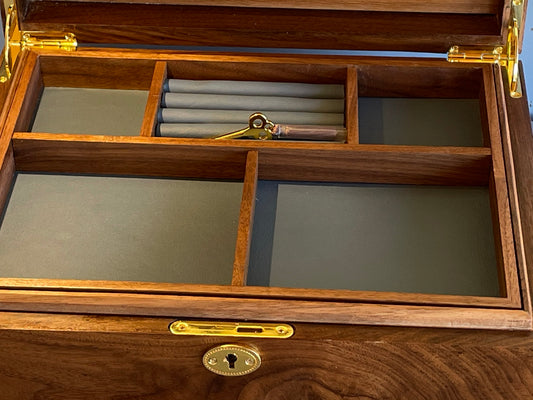 Walnut Peacock Inlay Jewellery Box grey leather lining